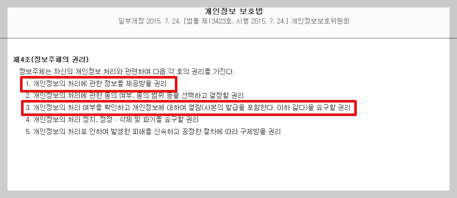 그렇다면 아파트나 상가, 공용주차장 CCTV열람을 위해서는 결국 경찰을 대동해야할까요? 아닙니다. 앞서 개인정보보호법에 따라 정보주체자가 보여달라고 당당하게 권리 행사를 할 수 있습니다.